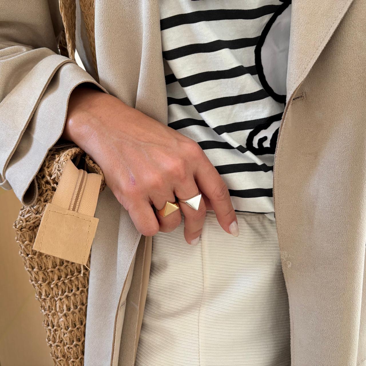 OBS: Os demais acessórios usados pela modelo para compor o look são vendidos separadamente. O valor do anel Triângulo é referente à unidade;