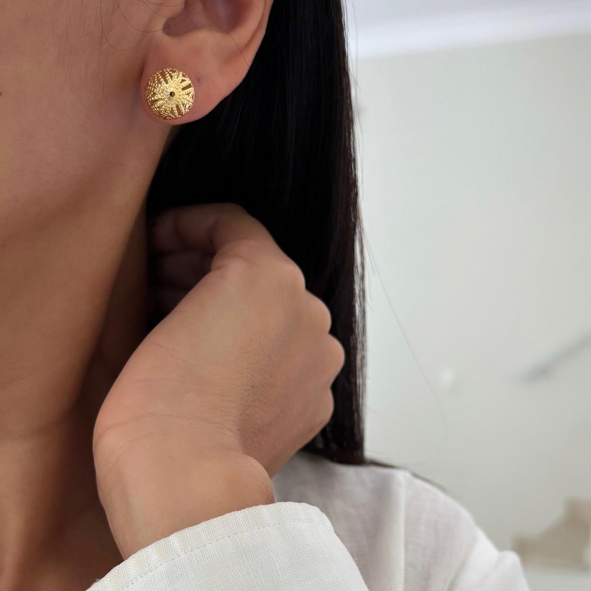 O brinco de esfera dourada texturizada combina a forma clássica de bolinha com um toque de sofisticação dado pela textura.